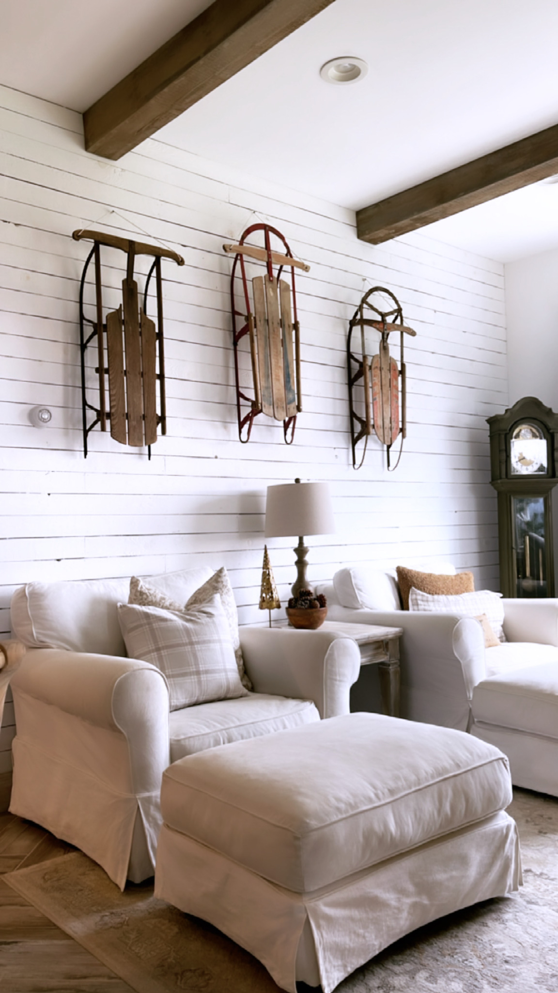 I love bringing out some of my favorite antiques for Christmas. I used my vintage sleigh bench under the tree, an old handmade wooden snow shovel on the porch, and hung three runner sleds on the wall in the living room!