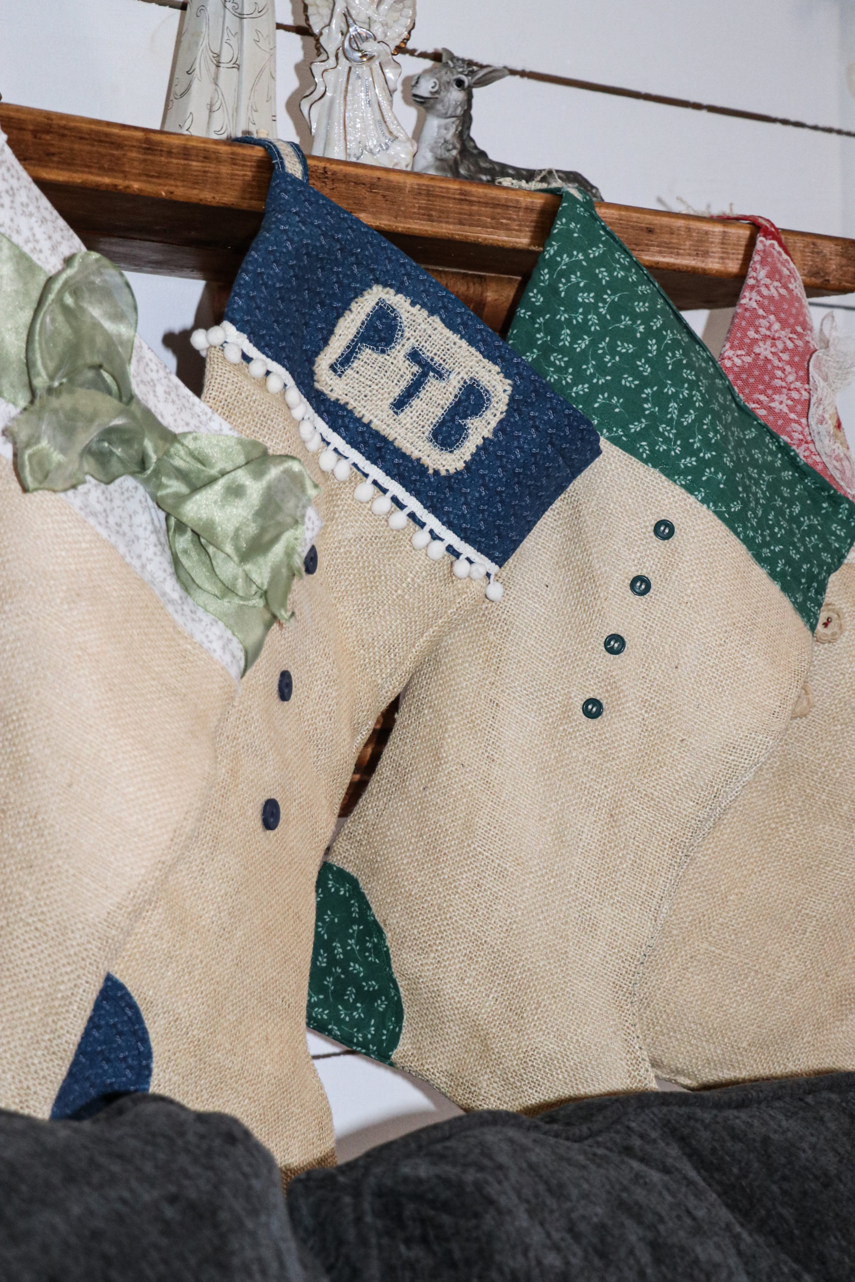 I built another shelf for the loft last year and decorated it with our nativity set that was passed down to me by a family member. The stockings here are the ones I made for our family when we first had our kids and these are the ones Santa fills!